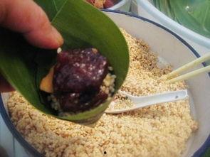 4. 加馅料:在糯米中间放入红枣、豆沙、肉等馅料,可以根据个人口味调整。